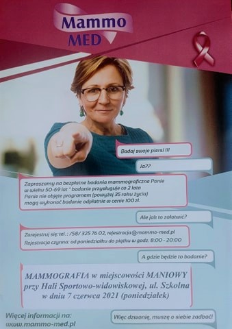 Już niebawem tj. 7 czerwca 2021 r. obok hali sportowej w Maniowach (ul. Szkolna 2) odbędą się bezpłatne badania mammograficzne dla kobiet w wieku 50-69 lat. Te z Pań, które nie są objęte programem profilaktycznym, a ukończyły 35 rok życia również zapraszamy. Opłata za mammografię, w tym przypadku wynosi 100 zł.