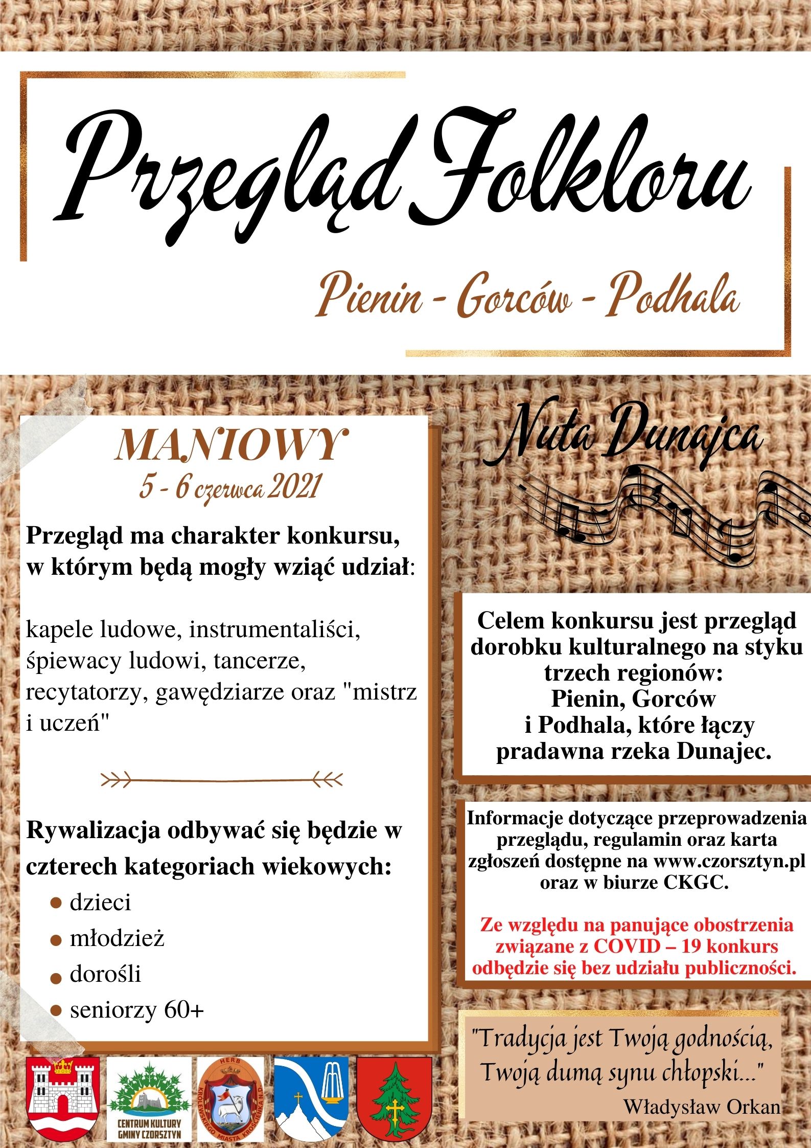 Dyrektor Gminnego Centrum Kultury informuje, że regulamin konkursu Nuta Dunajca uległ zmianie. Aktualizacja regulaminu polega na wprowadzeniu zapisu : Konkurs Nuta Dunajca skierowany jest do górali zamieszkujących pasma Pienin, Gorców i Podhala administracyjnie obejmujący : Miasto Nowy Targ, Gminę Nowy Targ (wsie: Waksmund, Ostrowsko, Łopuszna, Harklowa, Knurów, Szlembark oraz Dębno), Gminę Czorsztyn, Miasto i Gminę Szczawnica, Gminę Krościenko n/D oraz Gminę Ochotnica, które łączy nurt pradawnej rzeki Dunajec. Pozostałe zapisy regulaminu pozostają bez zmian