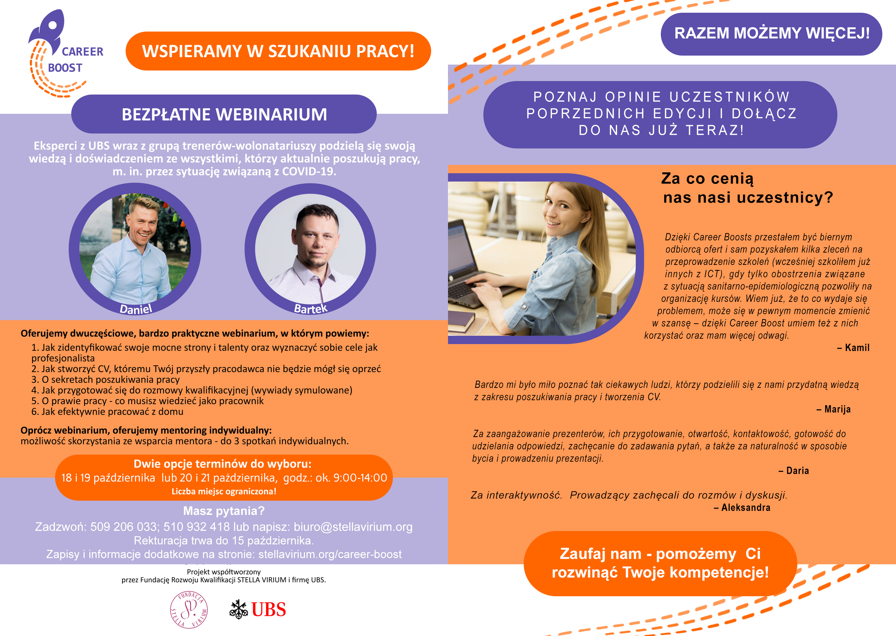 IV edycja projektu Career Boost - bezpłatnego dwudniowego szkolenia online prowadzonego przez ekspertów jednej z wiodących międzynarodowych firm – UBS, skierowanego m.in. do osób:
