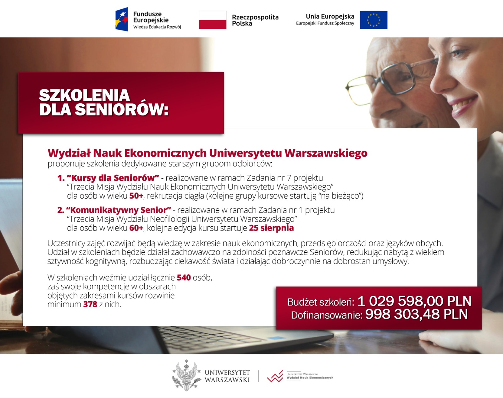 Drugie z proponowanych szkoleń „Kursy dla seniorów” ma na celu aktywizację seniorów z całej Polski (w wieku 50+) z wykorzystaniem opracowanego programu kształcenia w zakresie nauk ekonomicznych i przedsiębiorczości. Organizowane zajęcia będą miały charakter spotkań tematycznych, poświęconych różnym zagadnieniom ekonomicznym i psychologicznym.