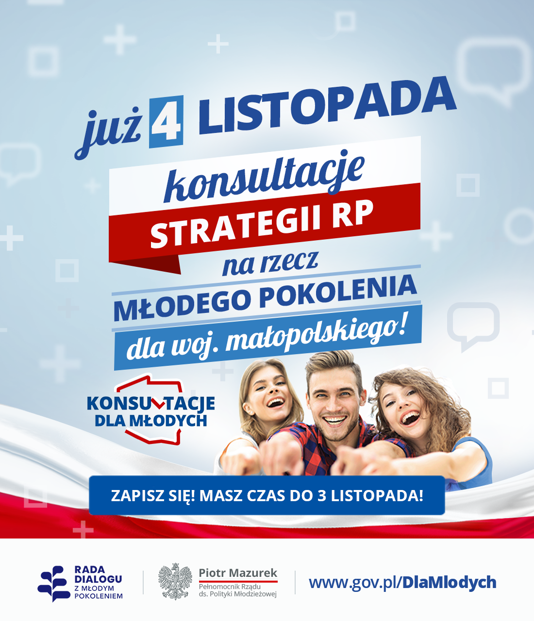 Już 4 listopada odbędzie się kolejna z wojewódzkich konferencji konsultacyjnych, na której wszyscy młodzi ludzie z województwa małopolskiego otrzymają możliwość zgłaszania pomysłów do „Strategii RP na rzecz Młodego Pokolenia”, wieloletniego planu działań państwa w obszarze polityki młodzieżowej. Zapisy przyjmowane będą do 3 listopada (środa) do godziny 12:00.