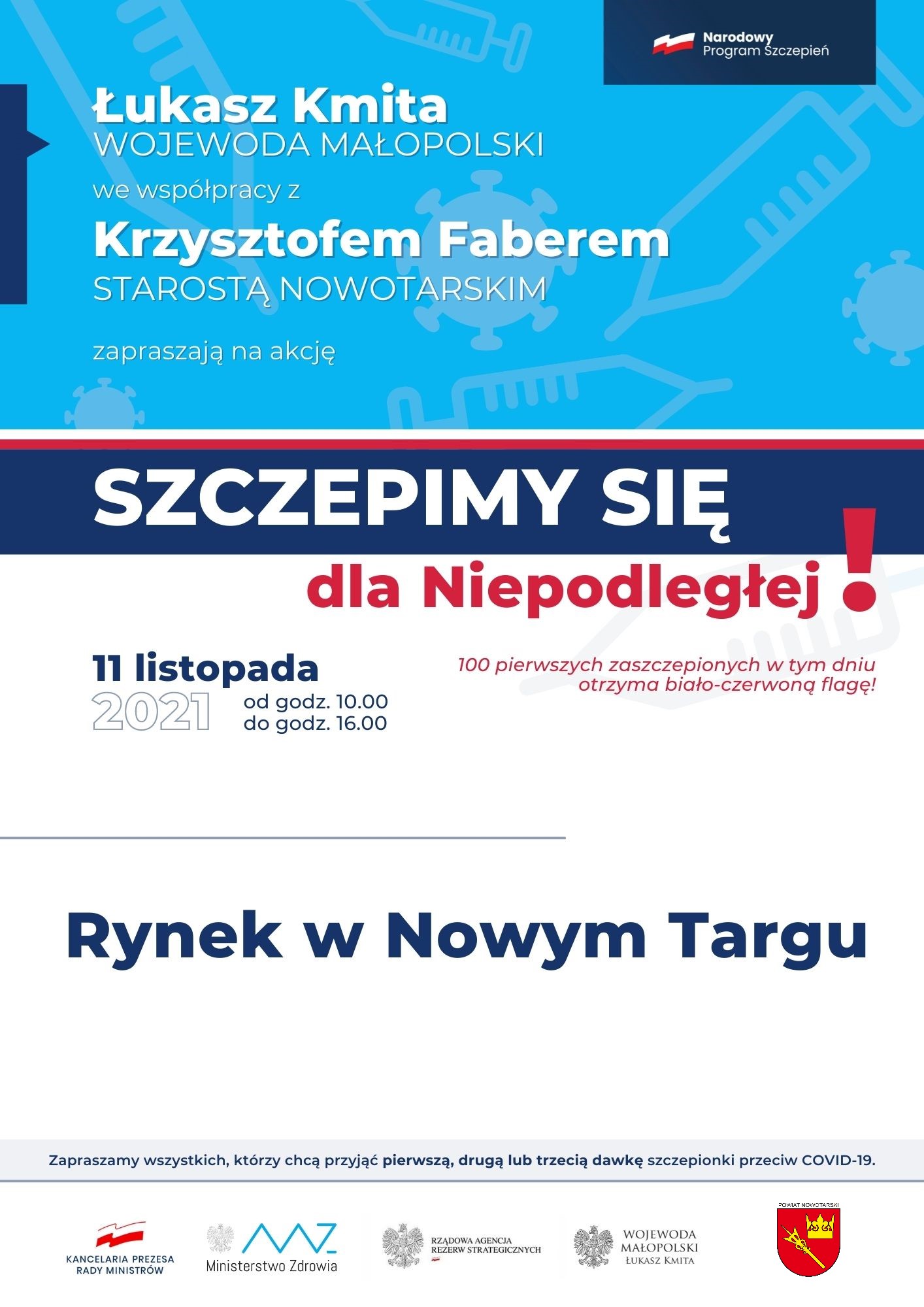 Powiat Nowotarski włącza się w akcję „Szczepimy się dla Niepodległej”, której inicjatorem jest Wojewoda  Małopolski Łukasz Kmita. Podczas obchodów Narodowego Dnia Niepodległości w dniu 11 listopada w godzinach 10.00-16.00 na Rynku w Nowym Targu uruchomiony zostanie mobilny punkt szczepień. Szczepienia realizować będzie nasz  podmiot leczniczy – Podhalański Szpital Specjalistyczny im. Jana Pawła II w Nowym Targu. Zapraszamy wszystkich chętnych powyżej 18 r. ż. na szczepienie jednodawkową szczepionką firmy Johnson&Johnson  a także  osoby od 12 r.ż. szczepionką firmy Pfizer. Dawka przypominająca dedykowana dla wszystkich osób powyżej 18 r. ż może zostać podana po upływie 6 miesięcy od zakończenia pełnego cyklu szczepienia.