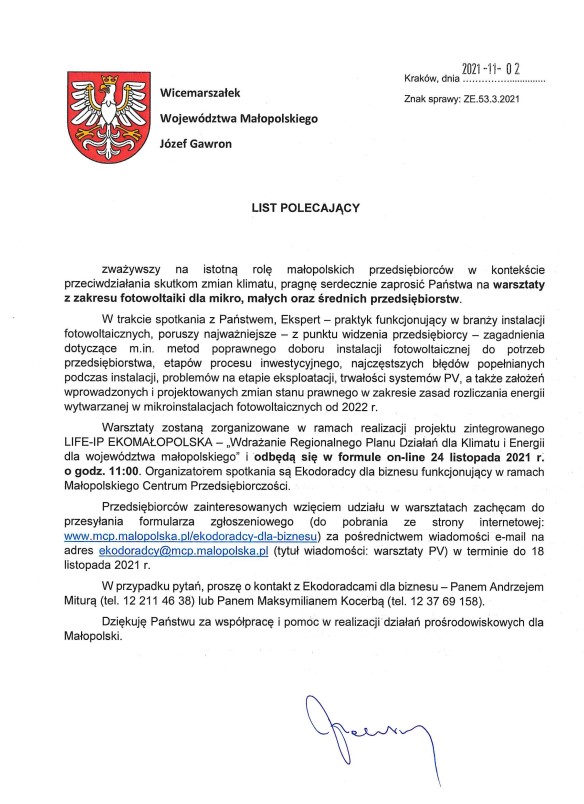 Zapraszamy przedstawicieli mikro-, małych i średnich przedsiębiorstw z województwa małopolskiego, zainteresowanych montażem nowej instalacji PV lub rozbudową już istniejącej.