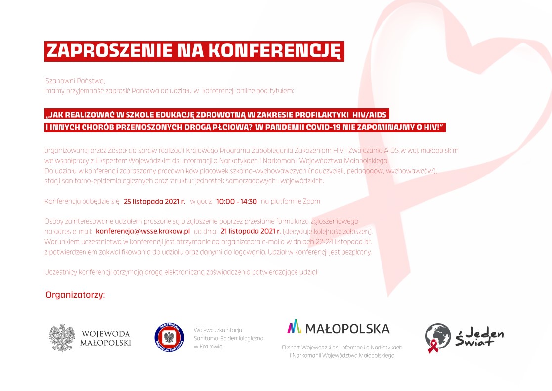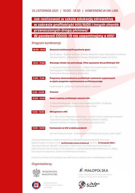 Konferencja on-line "Jak realizować w szkole edukację zdrowotną w zakresie profilaktyki HIV/AIDS i innych chorób przenoszonych drogą płciową? W pandemii COVID-19 nie zapominajmy o HIV!" - 25 listopada 2021 r. Szczegóły poniżej.