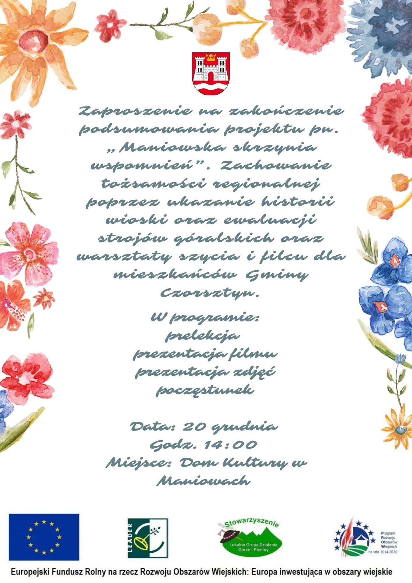 Realizowany przez Urząd Gminy Czorsztyn oraz KGW „Maniowy” projekt pn. „Maniowska skrzynia wspomnień”. Zachowanie tożsamości regionalnej poprzez ukazanie historii wioski oraz ewaluacji strojów góralskich oraz warsztaty szycia i filcu dla mieszkańców Gminy Czorsztyn. dobiega końca!