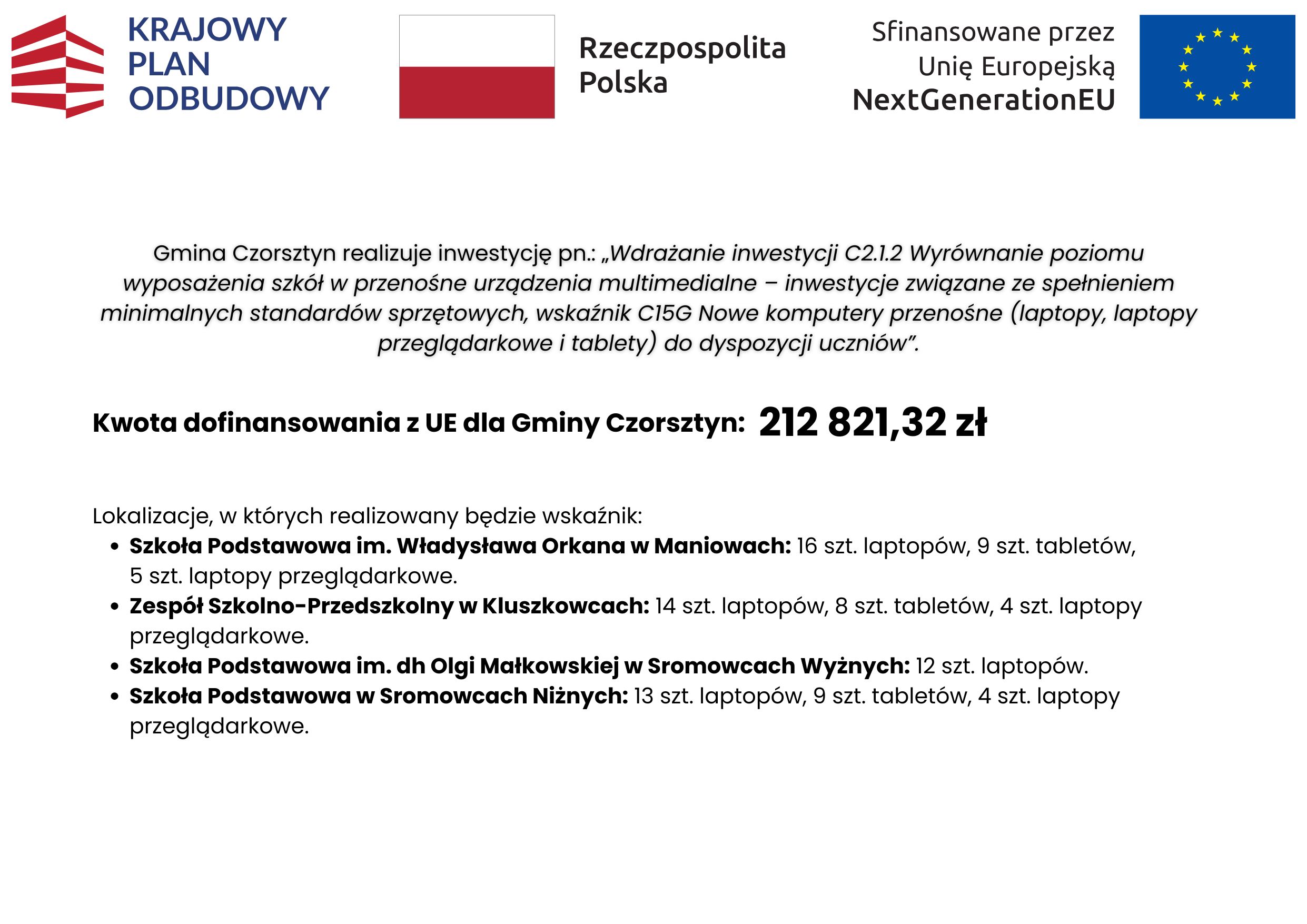 Gmina Czorsztyn realizuje inwestycję pn.: „Wdrażanie inwestycji C2.1.2 Wyrównanie poziomu wyposażenia szkół w przenośne urządzenia multimedialne – inwestycje związane ze spełnieniem minimalnych standardów sprzętowych, wskaźnik C15G Nowe komputery przenośne (laptopy, laptopy przeglądarkowe i tablety) do dyspozycji uczniów”