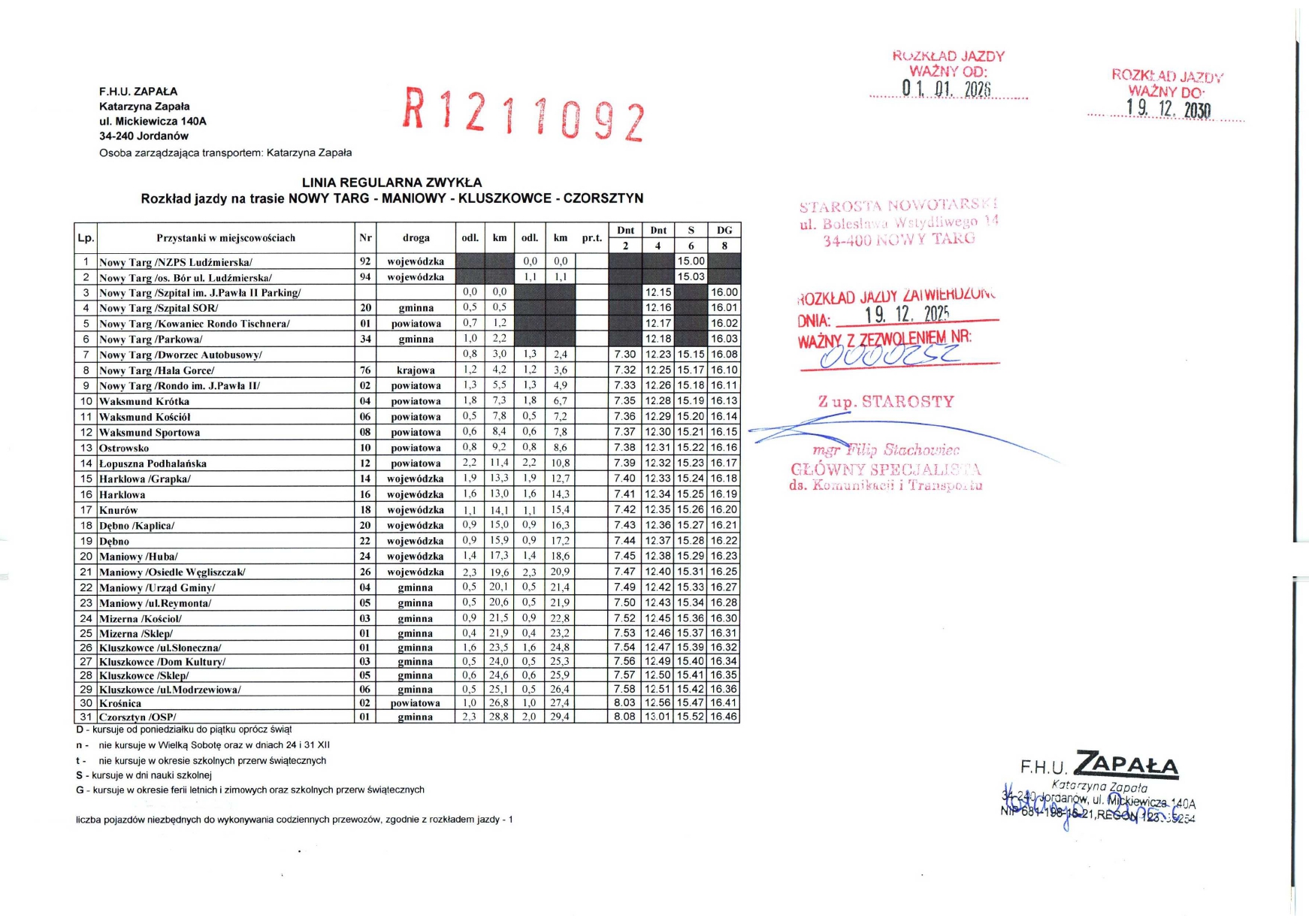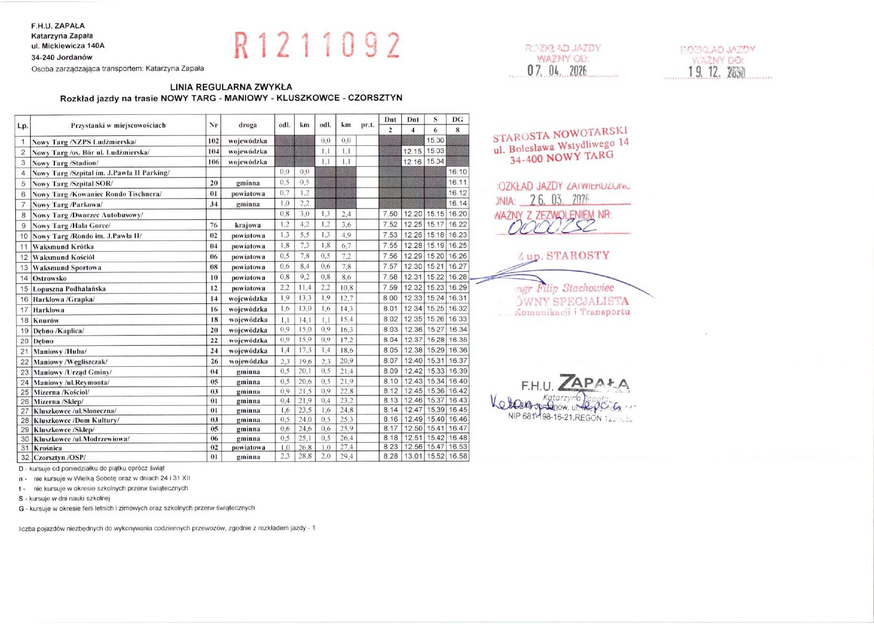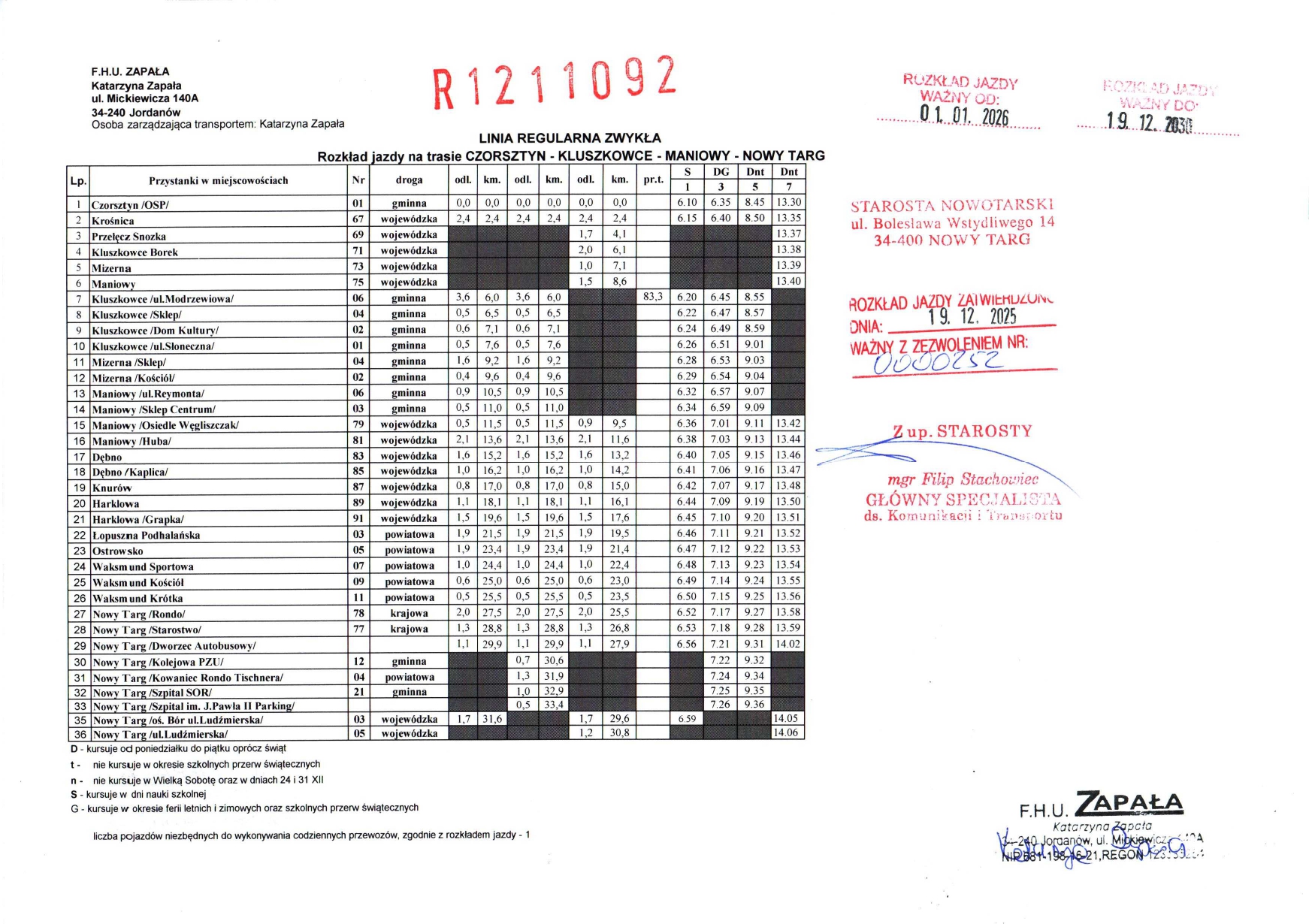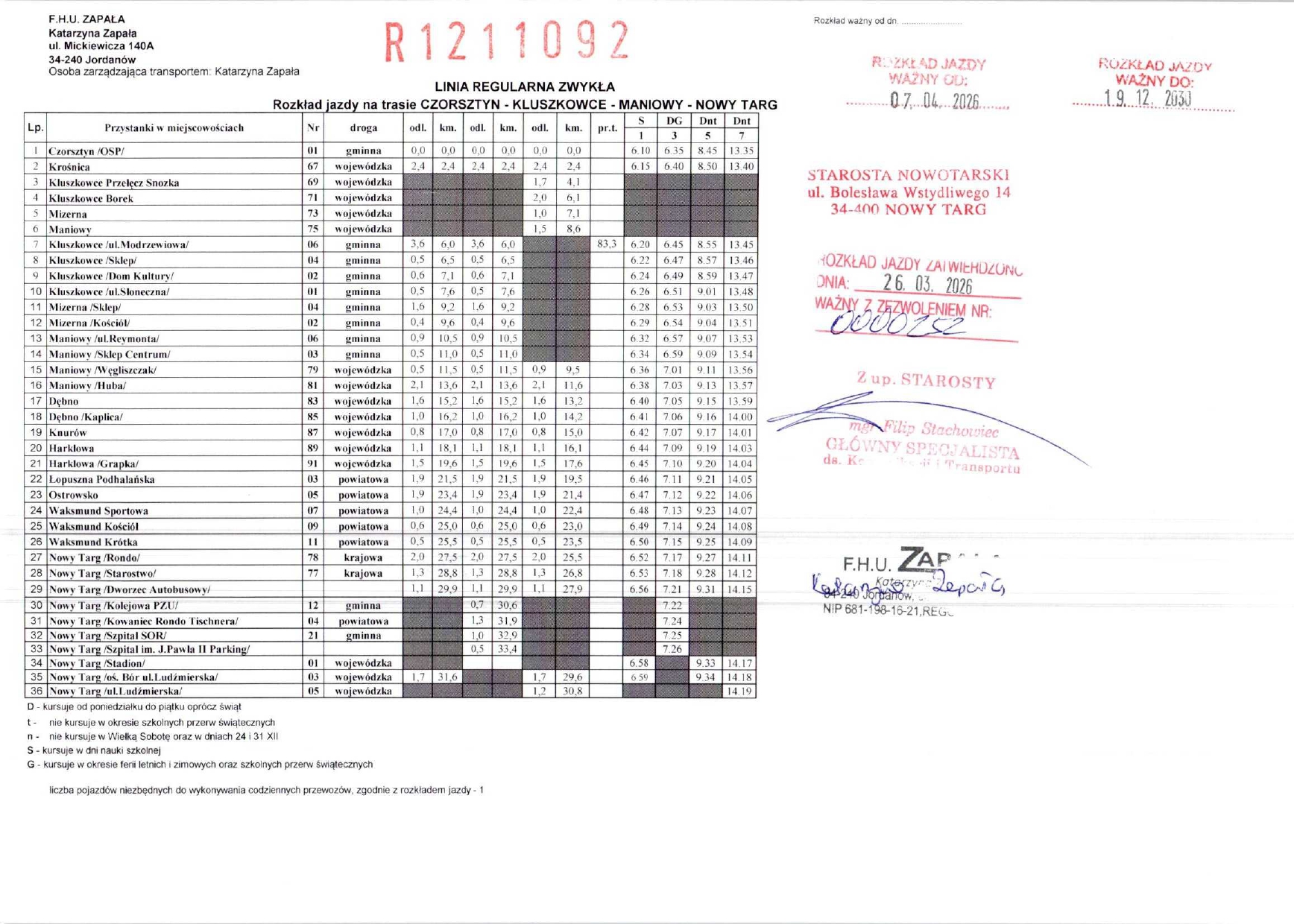 Rozkład jazdy - Linie regularne objęte zezwoleniami Starosty Nowotarskiego