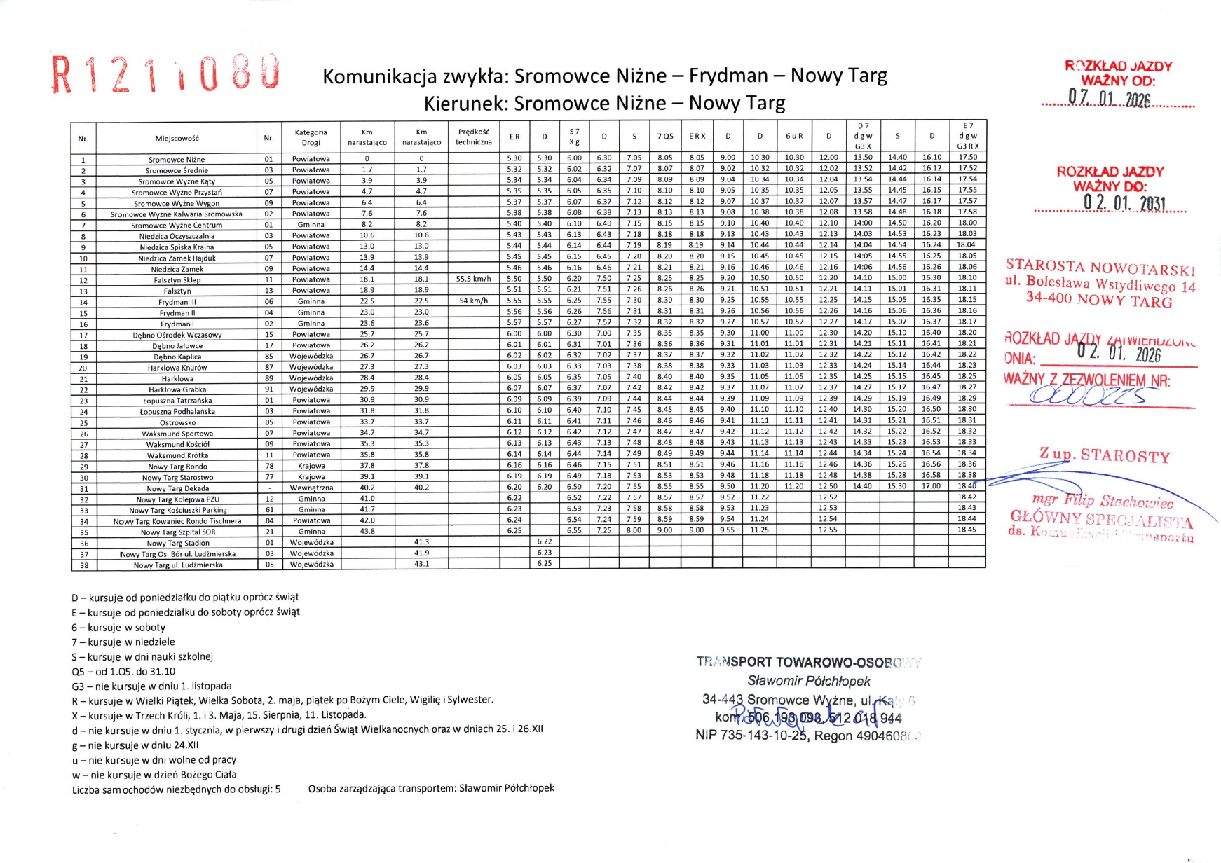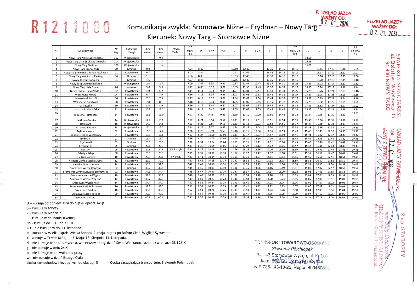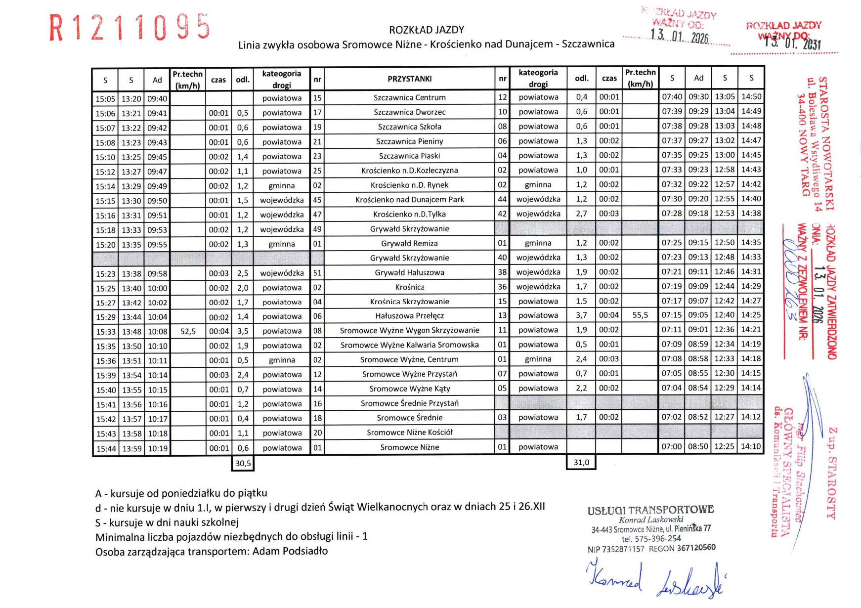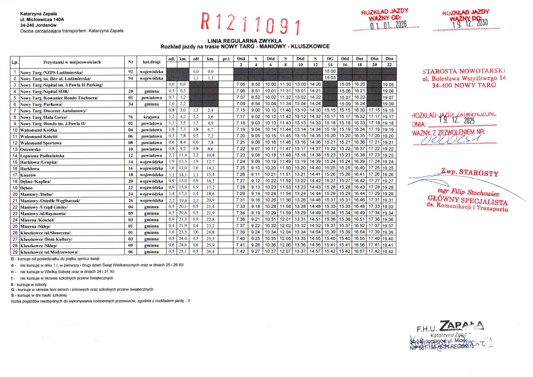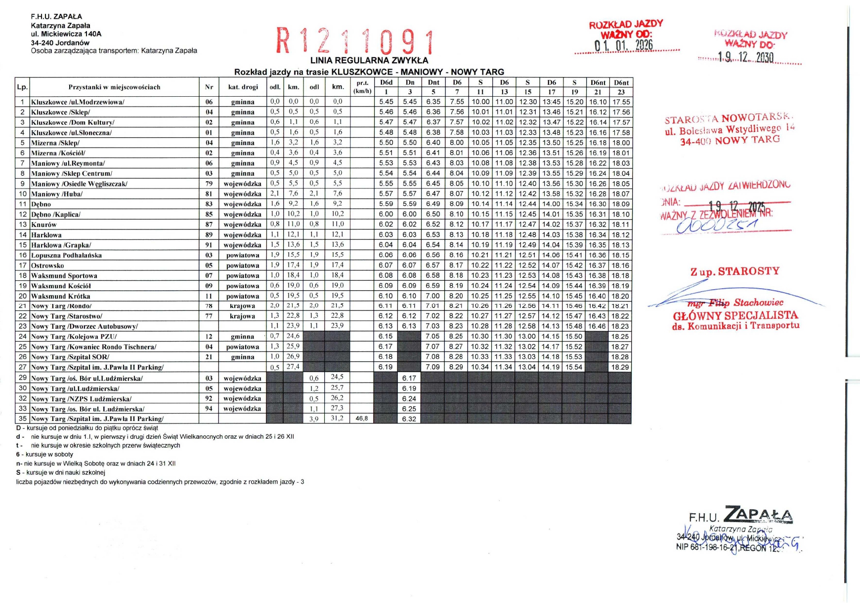 Rozkład jazdy - Linie regularne objęte zezwoleniami Starosty Nowotarskiego