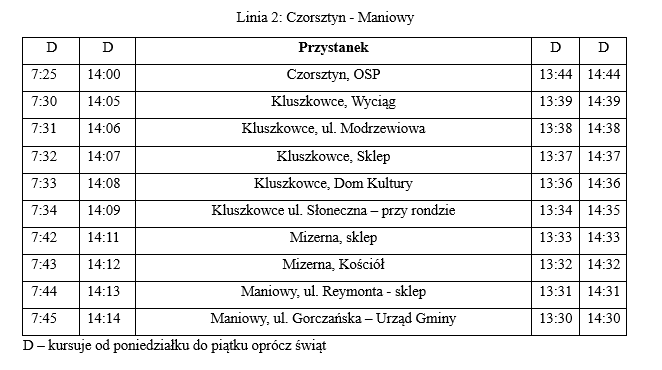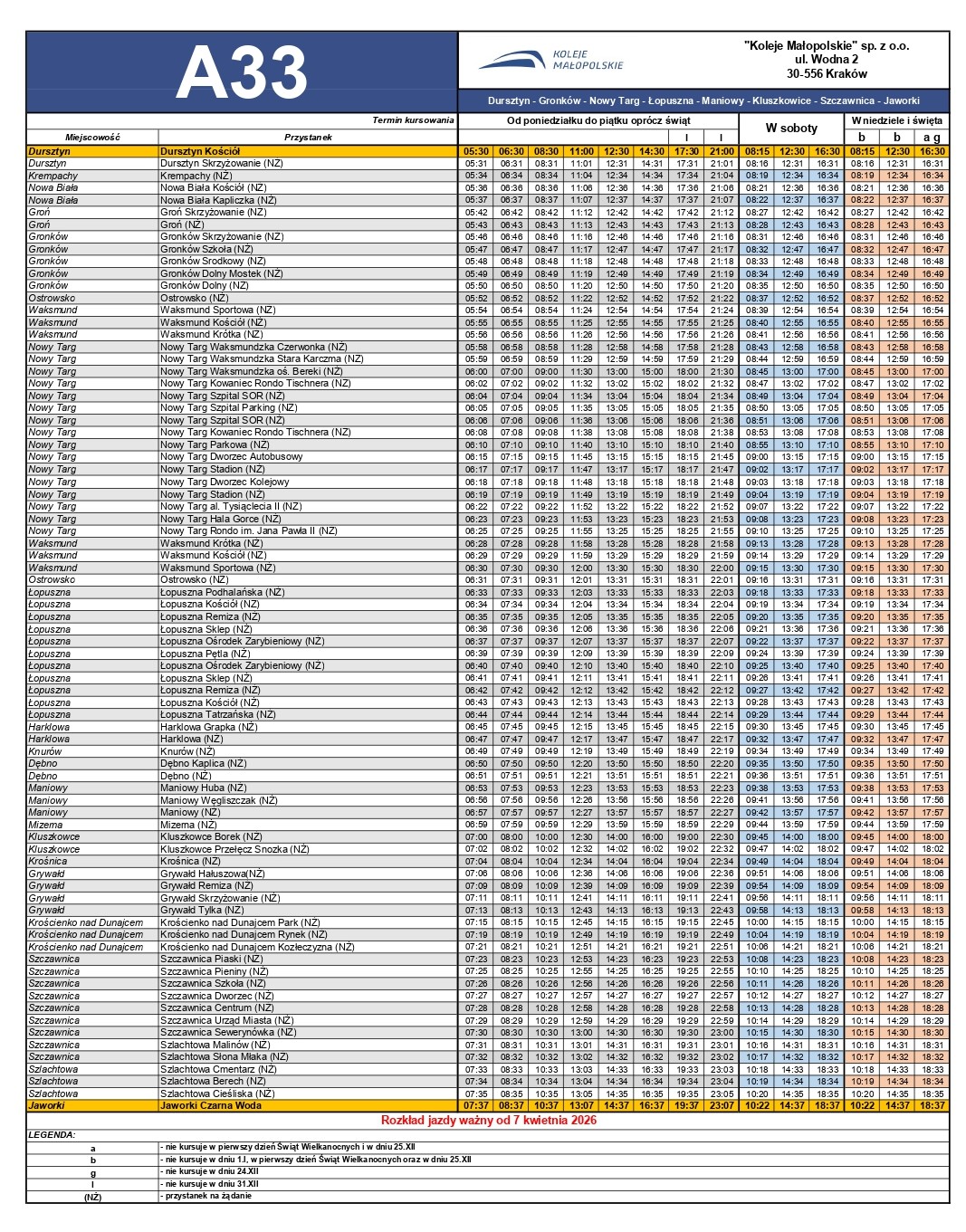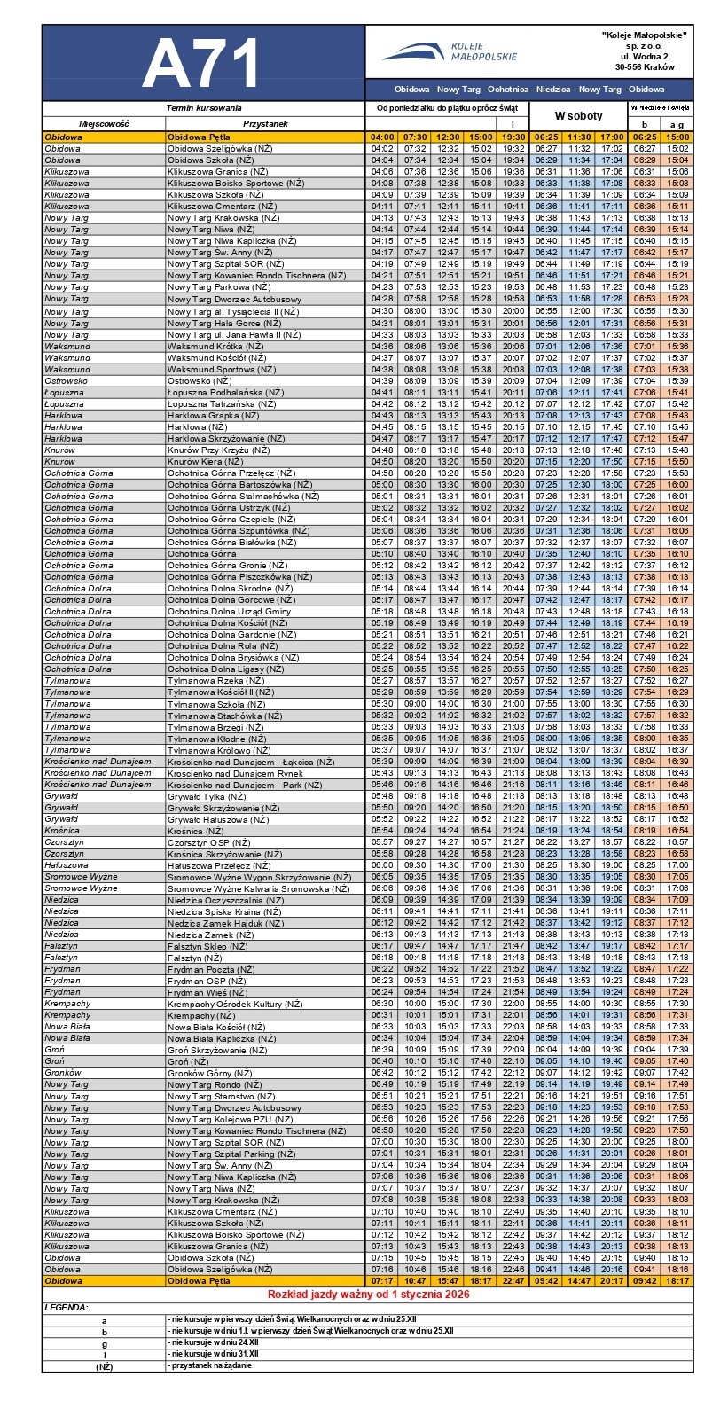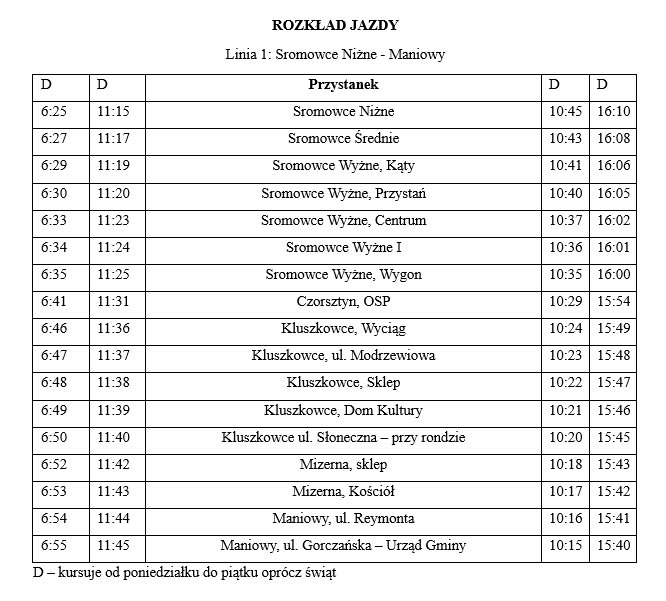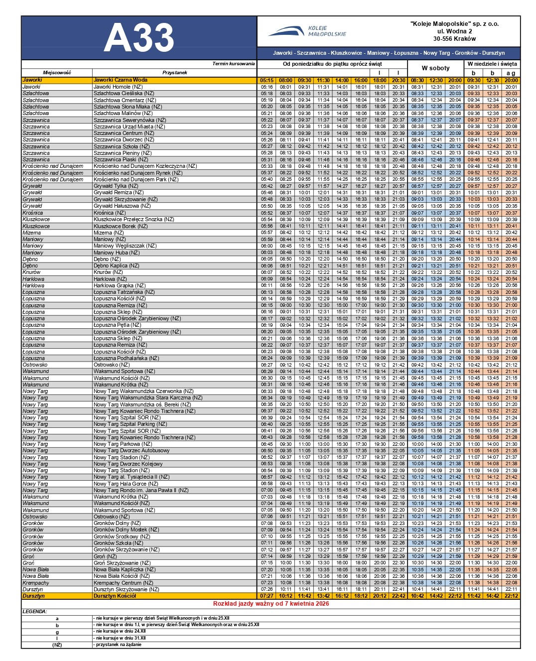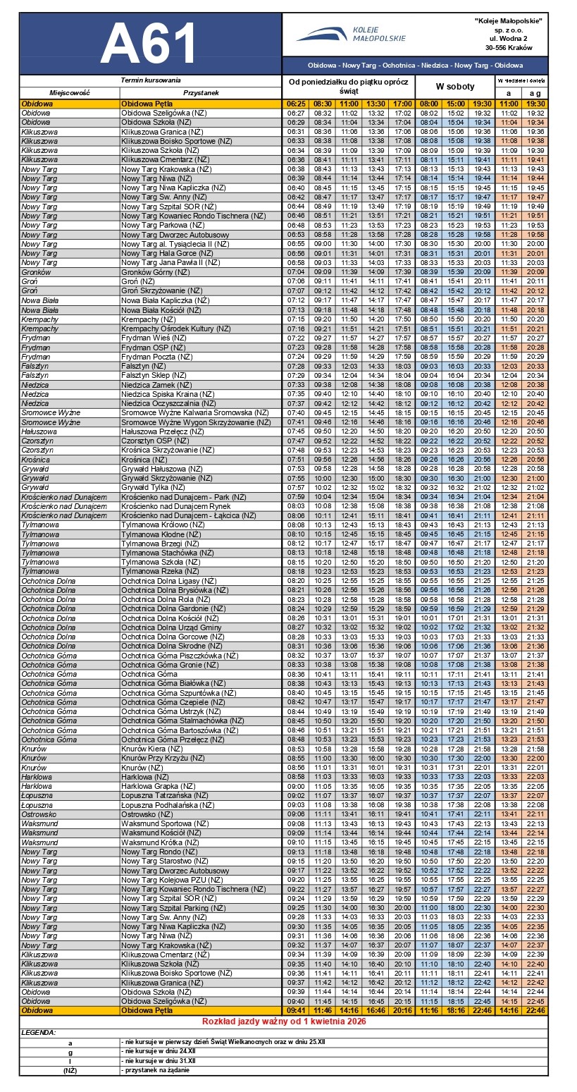 1. Czorsztyn - Kluszkowce - Maniowy - Nowy Targ (obowiązuje do 6 kwietnia 2026 r.)